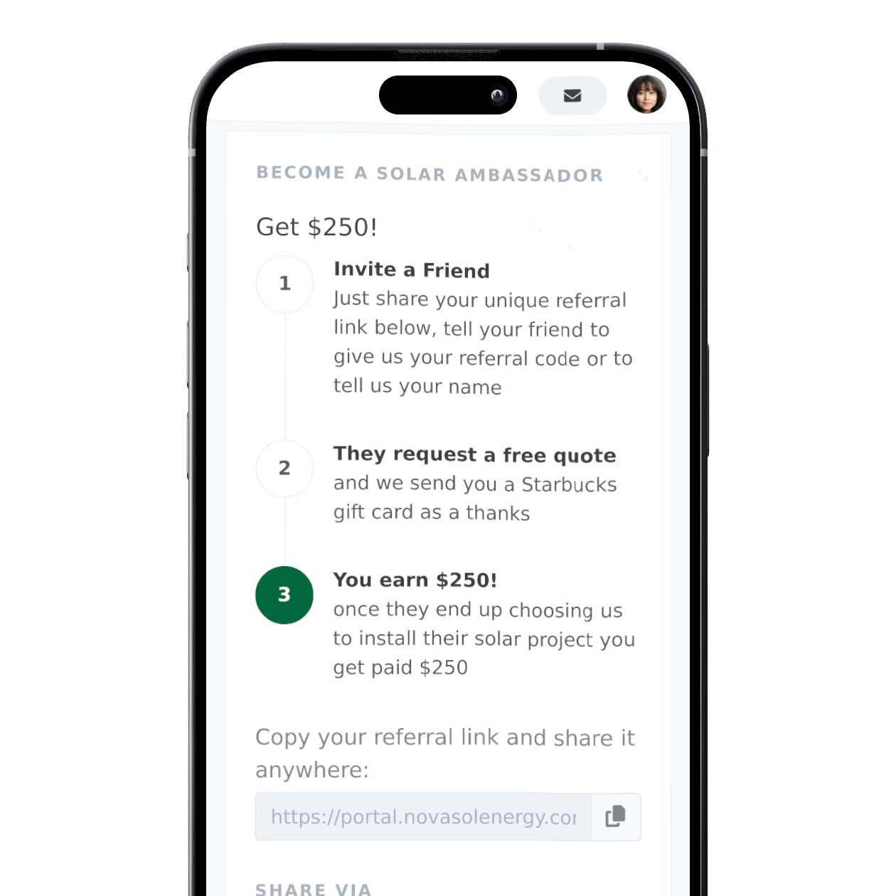 Have you been happy with NovaSol Energy? Refer a friend or family member conveniently by sending their contact info through the app or sharing your personalised referral page with them and earn money as a thank you.